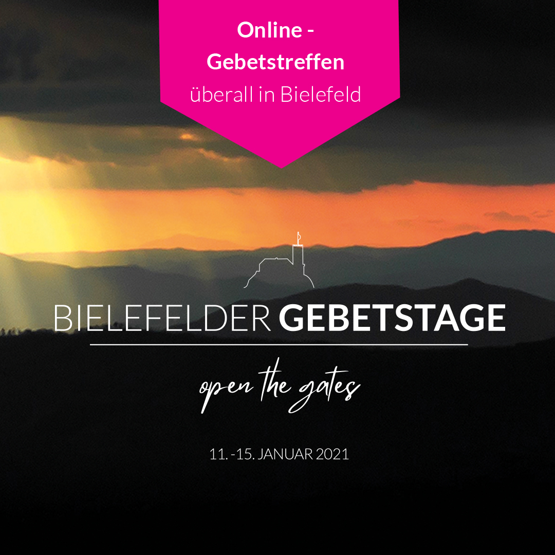 Den traditionellen Start in das neue Jahr mit den Bielefelder Gebetstagen wollen wir auch 2021 weiterführen. Sie werden vom 11.-15. Januar unter dem Motto „Open the Gates“ – „Öffnet die Tore“ als riesiges Zoom-Gebetstreffen stattfinden. An den fünf Abenden starten wir um 19.30 Uhr und jeder kann aktiv beteiligt sein, indem er während des Abends in einer „Breakout-Session“ (Kleingruppen) mit Christen aus anderen Gemeinden online zusammen betet. Der Link zu diesem Zoom-Treffen wird auf folgender Webseite rechtzeitig bekannt gegeben: